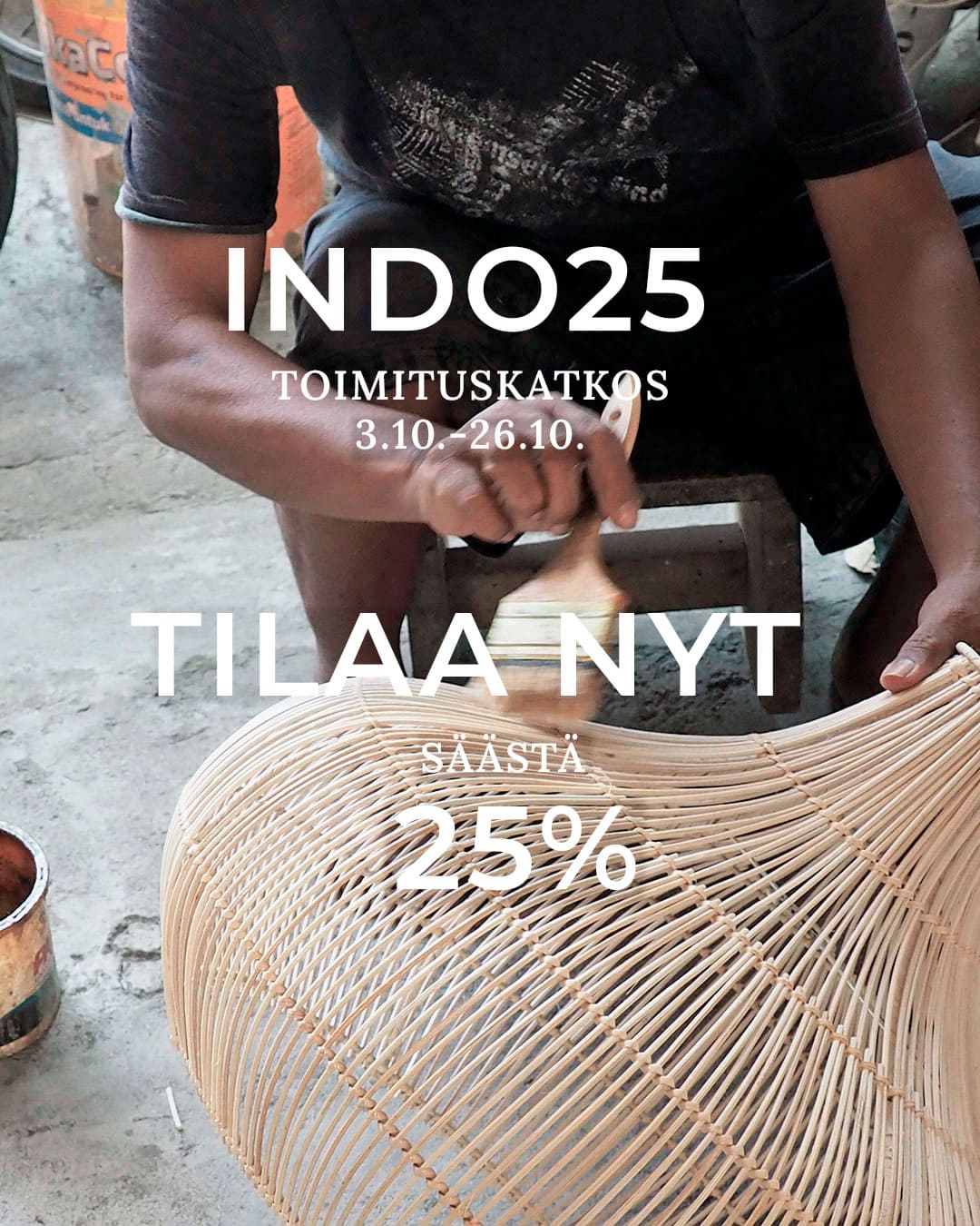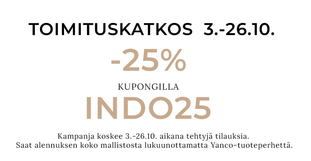 Varastomme on suljettuna 3.-26.10. mutta verkkokauppa auki 24/7. Kun teet tilauksesi toimituskatkon aikana, saat 25 %:n alennuksen kupongilla INDO25. Toimitukset käynnistyvät taas täydellä touhulla 27.10. alkaen.