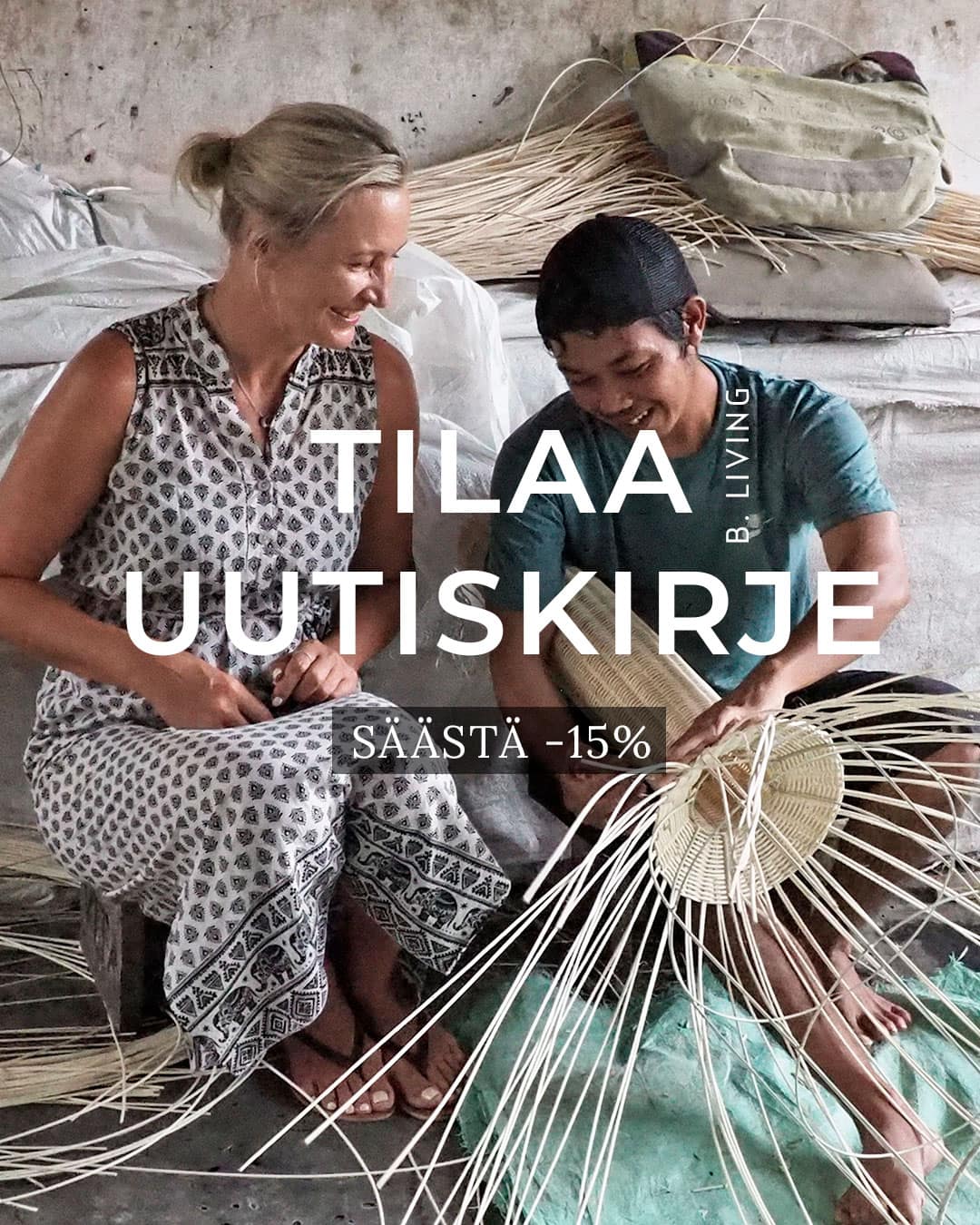 B. Living kumpuaa rakkaudesta laadukkaaseen käsityöhön ja luonnonmateriaaleihin. Teetämme mallistomme tuotteet käsityöyrittäjillä Indonesian saarilla, josta ne matkaavat varastollemme Raisiossa. Ostamalla tuotteen tuet sekä suomalaista verkkokauppaa että indonesialaisen käsityöyrittäjän elinkeinoa.