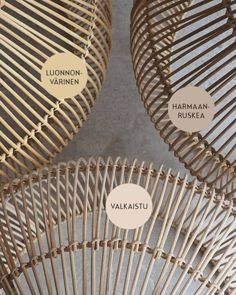 Rottinkivarjostin on ilmeeltään kevyt verrattuna muihin valaisinmateriaaleihin, ja se saa olla aavistuksen suurempi kuin mihin kenties olet tottunut. Valitse siis ennemmin hiukan ”ylisuuri” kuin liian pieni. Kokoluokituksemme on XS-XXL.