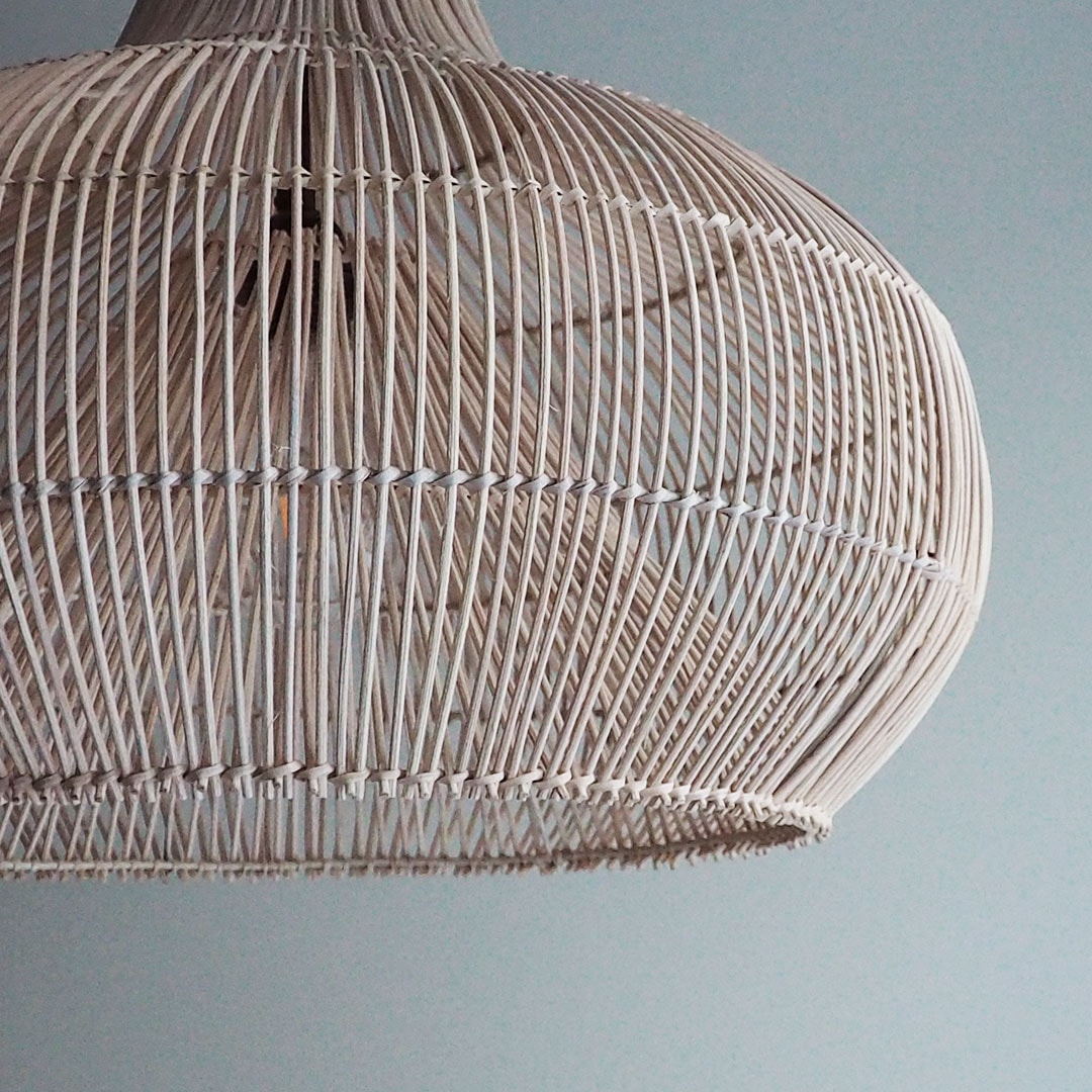 Pieni erä M-koon Inala-varjostimia on saanut pintaansa kevyen valkaisun. Kauniisti kaartuva varjostin on punottu viimeistellysti kahdessa eri kerroksessa. Se siivilöi valoa joka suuntaan.