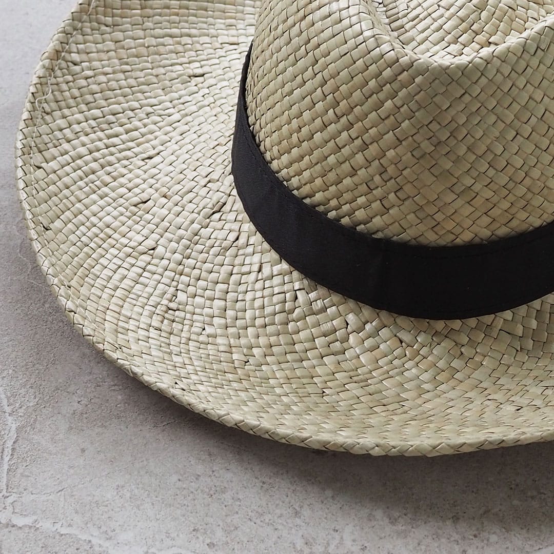 Kepeä klassinen olkihattu on punottu vaaleasta palmunlehdestä. Reunaa kiertää punonnan sisällä ohut metallilanka ja voit sen avulla muokata lierin haluamaasi asentoon. Musta silkkinen koristenauha.