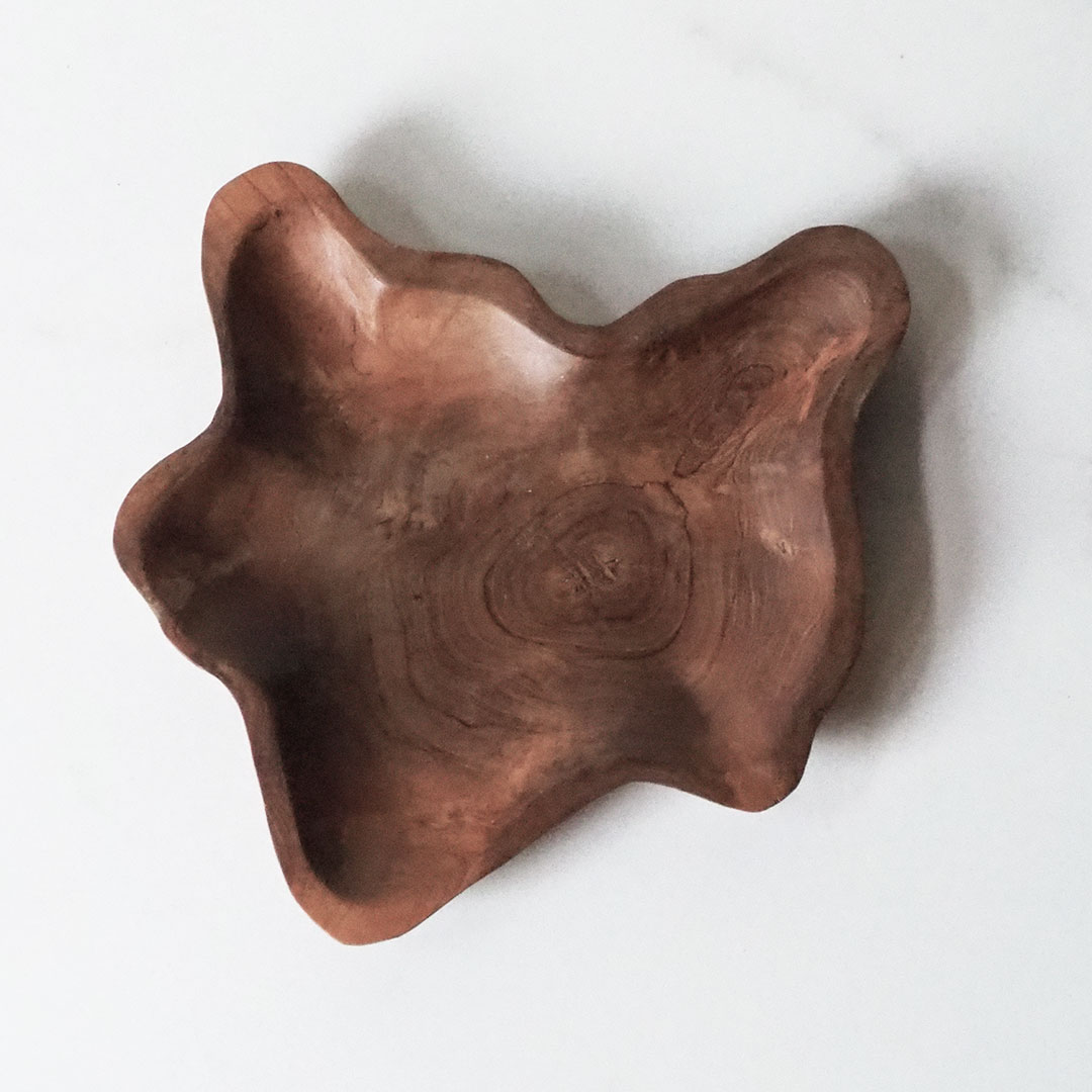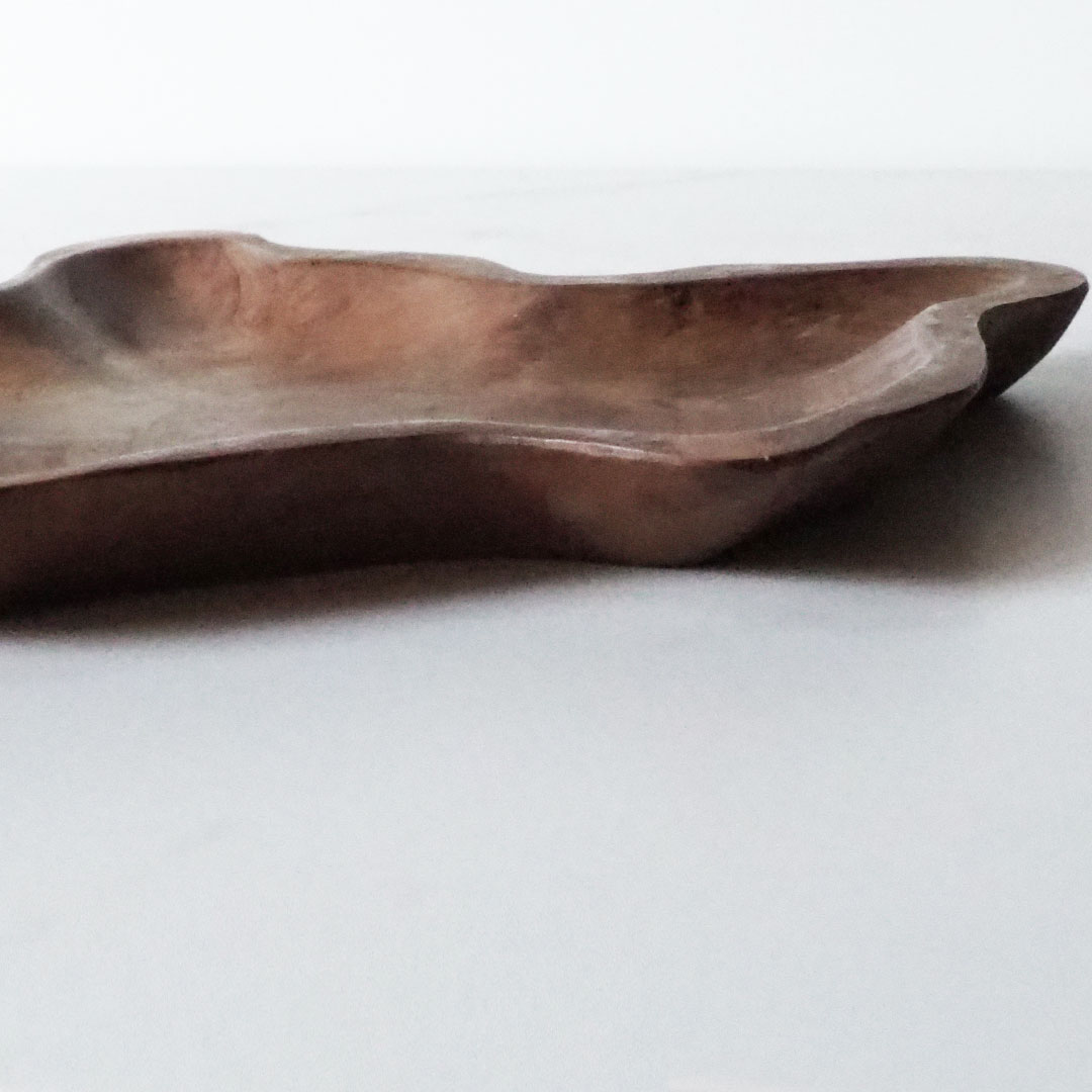 Löytö! Kaunismuotoinen tiikistä valmistettu tarjoilualusta on kuin taide-esine sellaisenaan. Se täydentää kattauksen tai toimii alustana pienelle asetelmalle pöydän tai tason päällä. Tarjotin sopii käytettäväksi myös elintarvikkeiden kanssa. Jos haluat huoltaa astian tai syventää sen sävyä, voit käsitellä sen tavallisella ruokaöljyllä. Pesuun suositellaan käsinpesua.