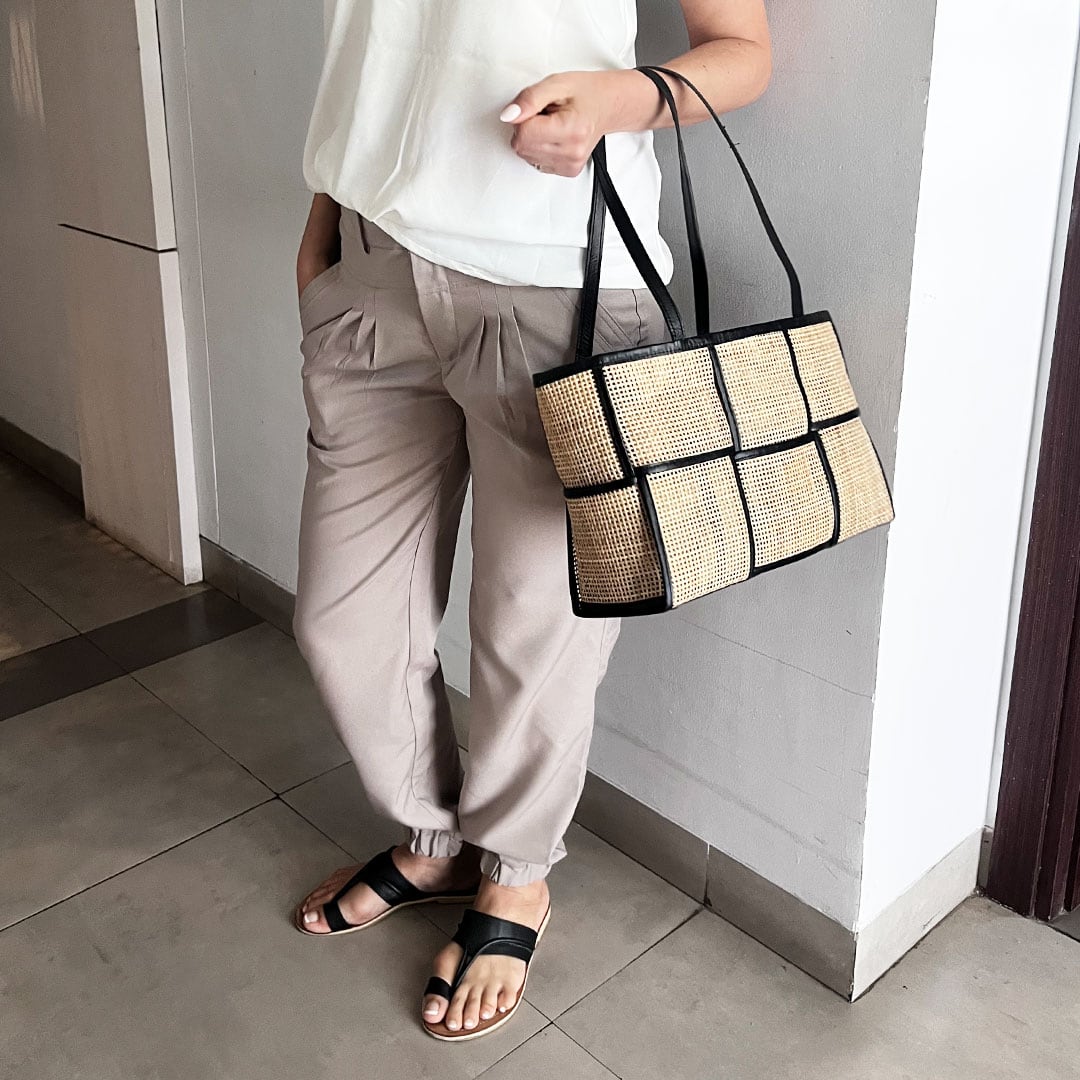 YKSITTÄISKAPPALE | Tässä kassissa vaalea kevyt rottinki saa ryhtiä mustista nahkayksityiskohdista. Kassi on valmistettu viimeistellysti jokaista yksityiskohtaa myöten. Täydellinen kaupunkikassi, johon saat mahtumaan jopa pienet ostokset.