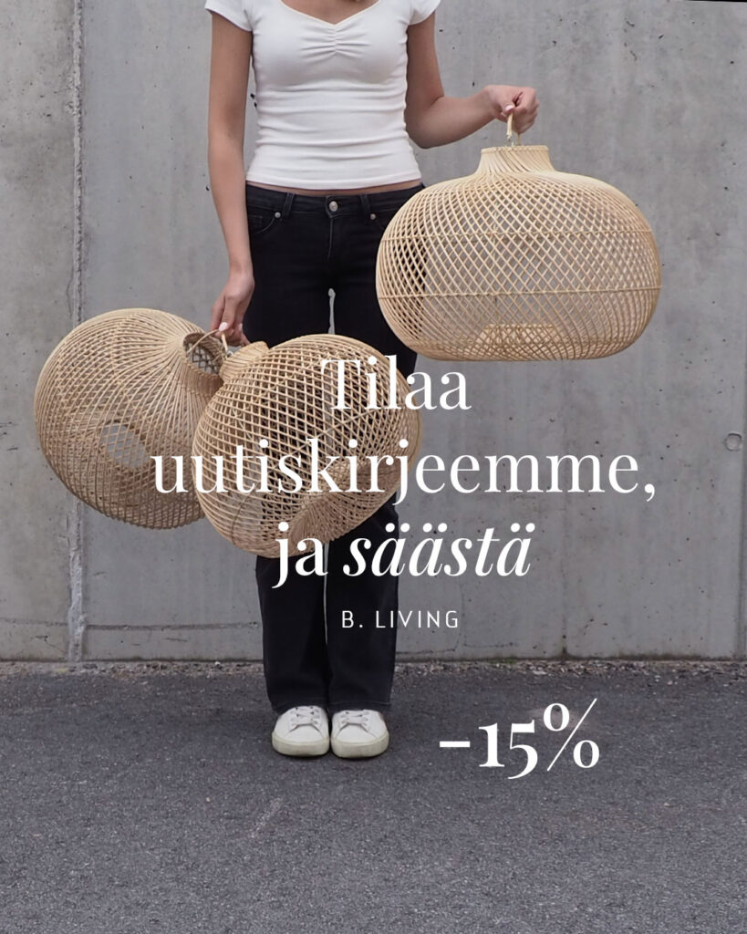 B. Living on suomalainen verkkokauppa. Etsimme, ostamme, suunnittelemme ja maahantuomme. Meillä on Indonesiassa oma rottinkivalaisimia punova tiimi. Heistä kokoneimmilla on jo yli 25 vuoden kokemus varjostimien valmistuksesta. Viimeksi maaliskuussa matkustimme tapaamassa heitä, ja kävimme läpi uusia suunnitelmia.